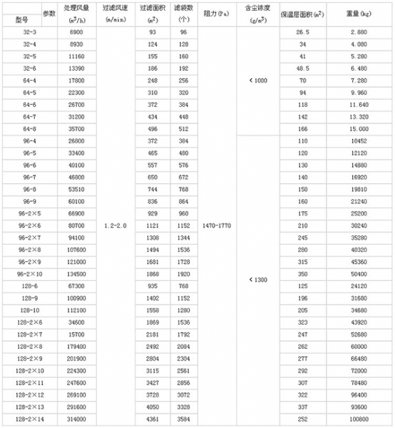 本系列產(chǎn)品共有33種規(guī)格,每室的袋有32、64、96、128袋四種,濾袋長度有2450mm和3060mm兩種,收塵效率可達99.9%以上,凈化后氣體的含塵濃度小于100mg/m3(標)本系列收塵器如用于寒冷地區(qū),當室外采暖計算溫度≤-25℃時,要設熱裝置。